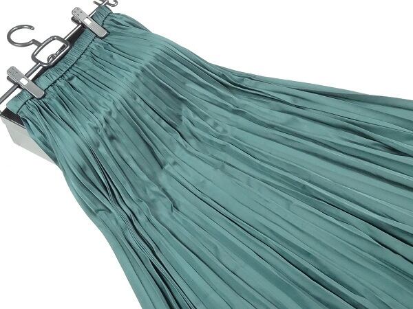 大胆に生地を使い細かいプリーツが上品なロングスカートです光沢感がありベ-シックなデザインですが女性らしさUP!。ウエストはゴム仕様でゆったりと着て頂けます。風に優しくなびき、歩くたびに着る人の足元を美しく見せてくれる一着です。裏地付。