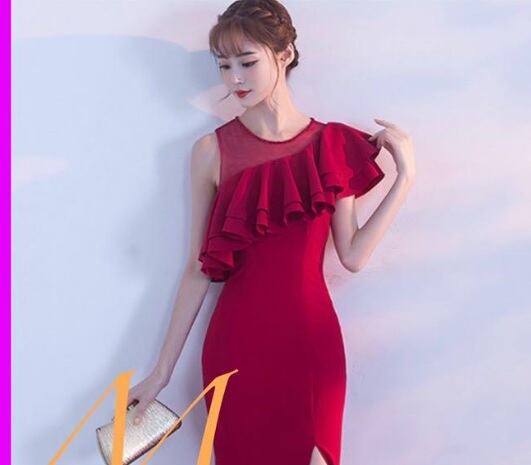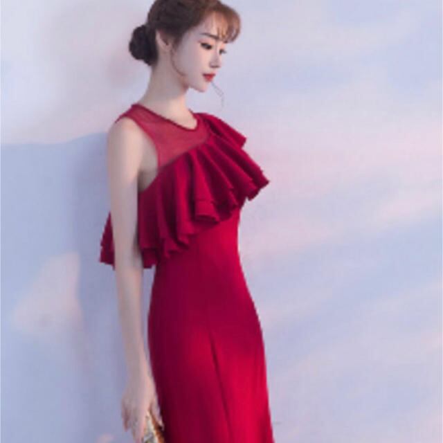 スリット入りフリルマーメイドドレスです。左サイドには太ももからすそにかけて大きなスリットを入れ、トップス部分はフリル仕様で華やかさを演出。全体的にしっかりとした伸縮性のある生地を使用。パーティやイベントなど、様々なシーンで、魅力的な印象を与えてくれる一枚です。裏地なし。左サイドファスナーあり。スリット裾から55cm。