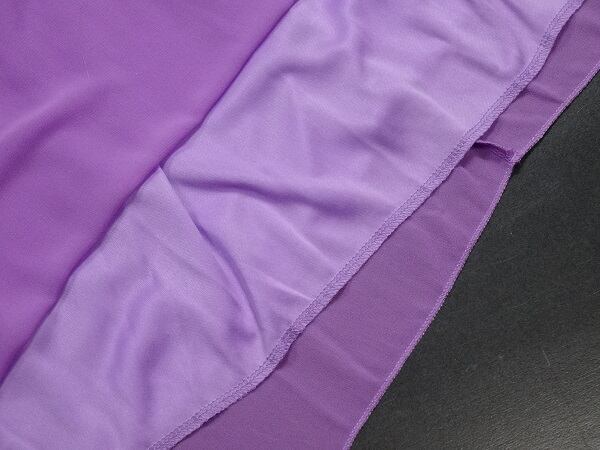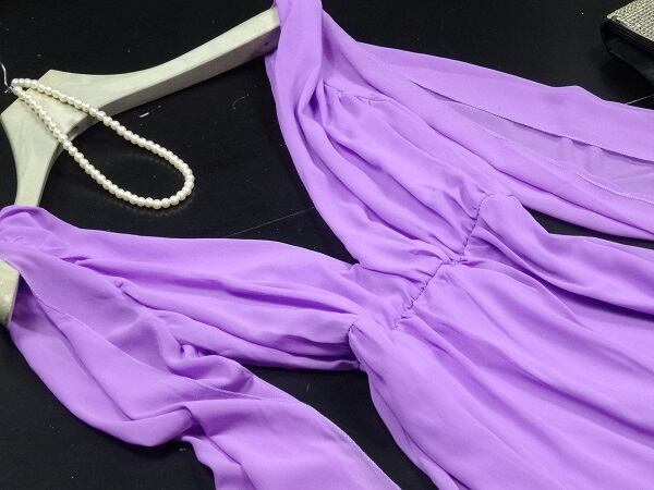 ノースリ-ブ振袖ロングドレスです。紫のシフォン地をふんだんに使用。袖の二の腕をカバーするシフォンが豪華かつエレガントな雰囲気を醸し出しています。前と後ろは同じデザインです。パーティやイベント、結婚式など、様々なシーンで、気品のある印象を与えてくれる一枚です。裏地付き。背中腰下ファスナ-有。ベルトは付いていません。