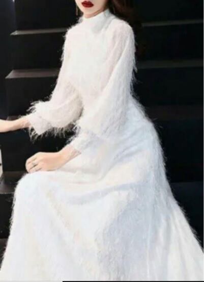エレガントフォーマルマキシ丈ワンピ-スです。全体が細い金糸で覆われた気品に満ちたとてもエレガントで上品なひとクラス上をいく一品です。結婚式・パ-ティ-等に最適です。背中ファスナ-有。裏地有。