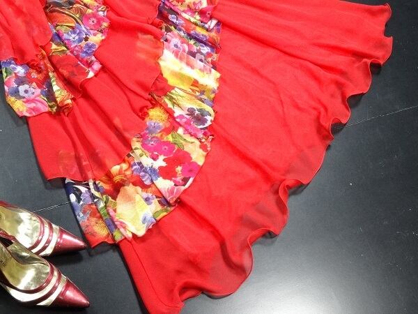 プリントフォーマルロングドレスです。赤のチュール地に、色とりどりの小花柄をプリントした華やかなデザインで袖はたっぷりしていて広がります。生地をたっぷり使用しているので、ダンスをされる方にも最適。軽やかな一枚です。裏地付き。背中ファスナ-有。