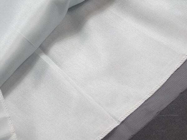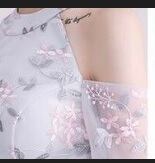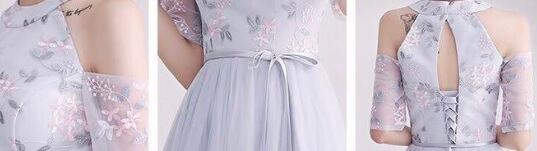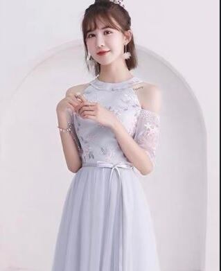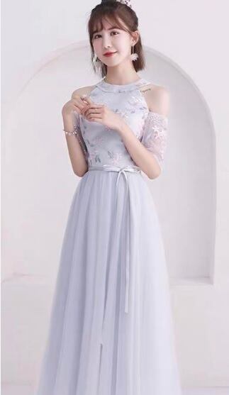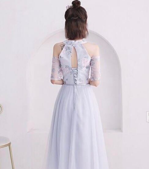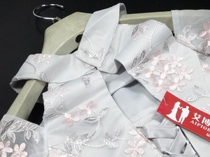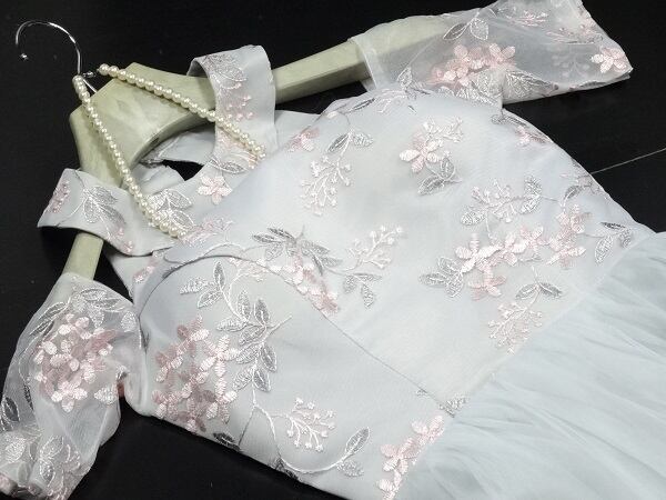 刺繍とチュールのロングドレスです。グレーのサテン地に同色のチュールをかぶせ、トップス部分は光沢のあるピンクやシルバ-の糸で刺繍を施したエレガントなデザイン。背中は編紐掛けなので、バストのサイズにゆとりをもって着用いただけます。パーティやイベント、結婚式など、様々なシーンで、気品のある印象を与えてくれる一枚です。背中網掛け。背中腰から下ファスナ-有。胸パット付。裏地有。