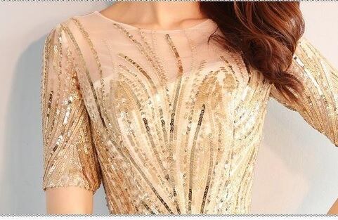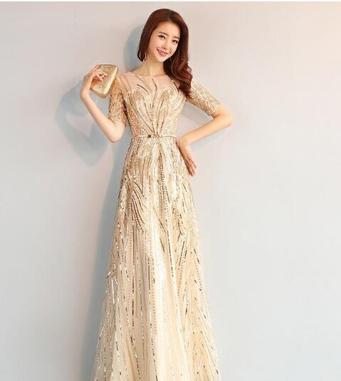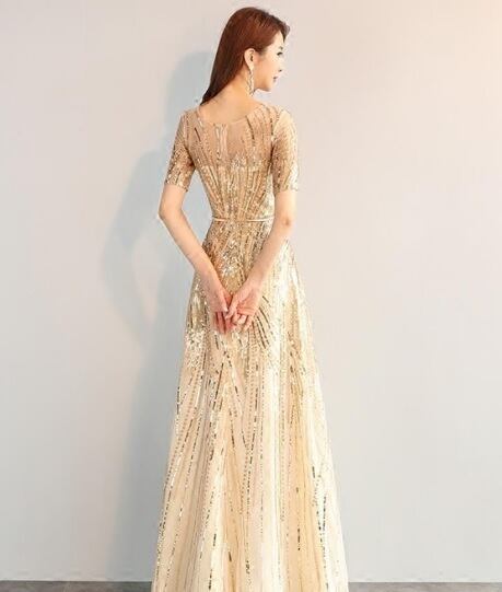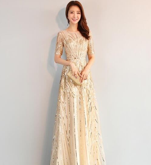 ビジュ-飾りチュ-ルパーティ-ロングドレスです。サテン地にチュ-ルが重ねられたデザインで全体にビジュ-が施されゴ-ルドの光沢が高級感を醸しだしてくれてます。とてもエレガントです。パーティやライブ、イベント、結婚式など、どんなシーンでも活躍してくれる一着です。背中ファスナー有。胸パット付。ベルト付。
