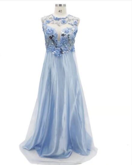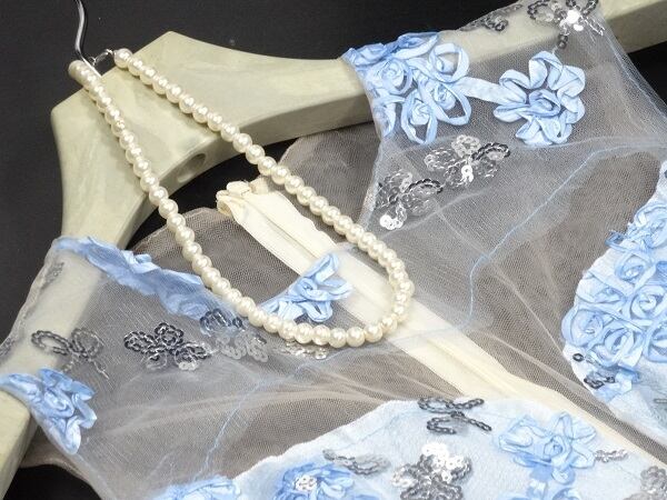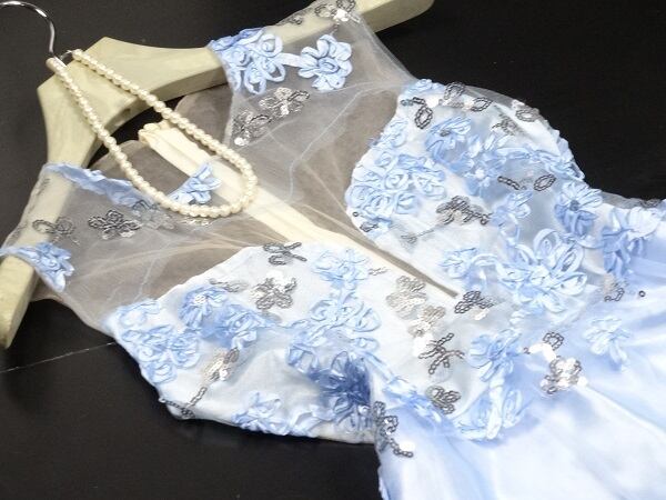 チュールとリボン刺繍のロングドレス。気品に満ちたとてもエレガントで上品なひとクラス上をいく一品です。トップス部分はチュールの上にリボン刺繍とスパンコールを施し、ウエストから裾まではさわやかな水色のサテン地の上にチュールをたっぷりと重ねゴージャスな印象に。胸元と背中側のチュール部分の透け感が、デコルテラインと背中をセクシーさの中にエレガントな印象を醸し出してくれています。背中ファスナ-有。裏地有。