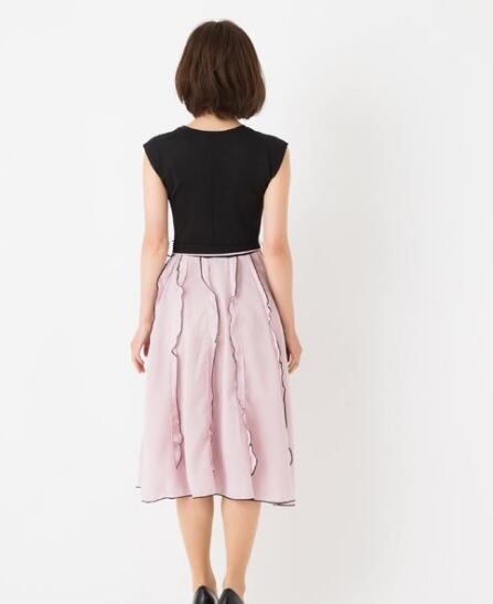 異素材フリルのワンピース。上半身は黒のジャージ素材で伸縮性があり、ウエストからスカート部分にかけてはスモーキーピンクのシフォンをたっぷりと使用。縦にフリルをとり、黒のバイアスがあくせんとになっていてとてもキュートな一着です。左脇ファスナ-有。裏地なし。ウエストリボンベルト付き。