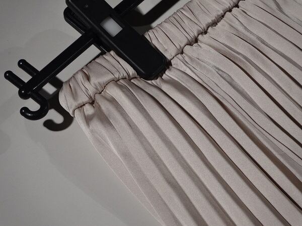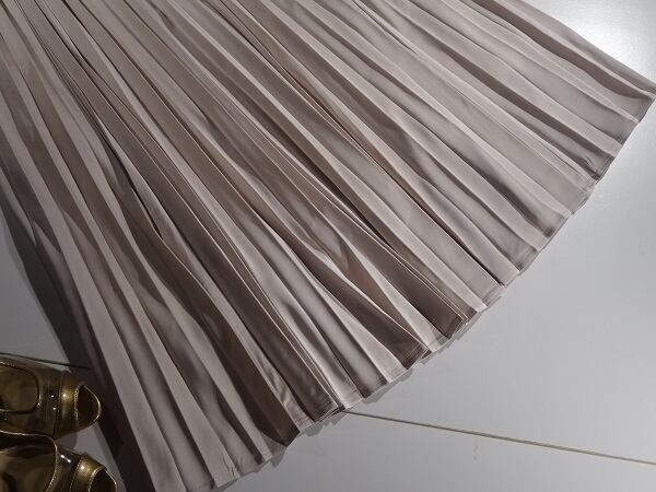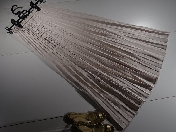 大胆に生地を使い細かいプリーツが上品なロングスカートです光沢感がありベ-シックなデザインですが女性らしさUP!。ウエストはゴム仕様でゆったりと着て頂けます。風に優しくなびき、歩くたびに着る人の足元を美しく見せてくれる一着です。裏地付。
