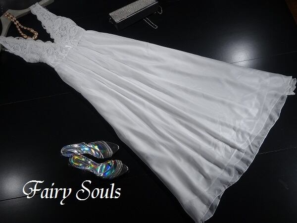 ピュアホワイトセクシーなドレス。胸元と背中が大胆にV字カットされたデザイン。レースがデコルテラインをセクシーに見せてくれています。パーティ、イベント、結婚式の二次会、コンサートなど幅広いシーンで活躍してくれる一着です。胸カップなし。背中ファスナー。裏地あり。多少透け感があるので、気になる方はインナー着用をお勧めします。