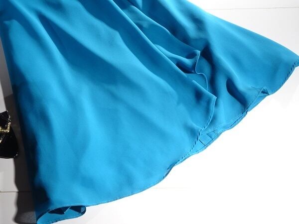 落ちついたブルーに白の立体花モチーフが映える膝下丈のワンピース。襟もとから左胸にかけて斜めに配置された白の花モチーフが上品な印象を与えてくれるデザイン。生地はやわらかく着心地抜群。袖は長いシーズン着て頂けるひじ丈サイズ。どんなシーンでも活躍してくれる一着です。肩パッド付。背中ファスナー。裏地付。