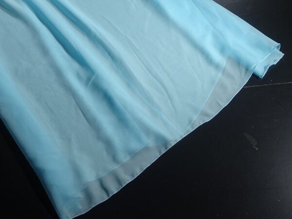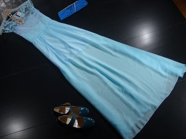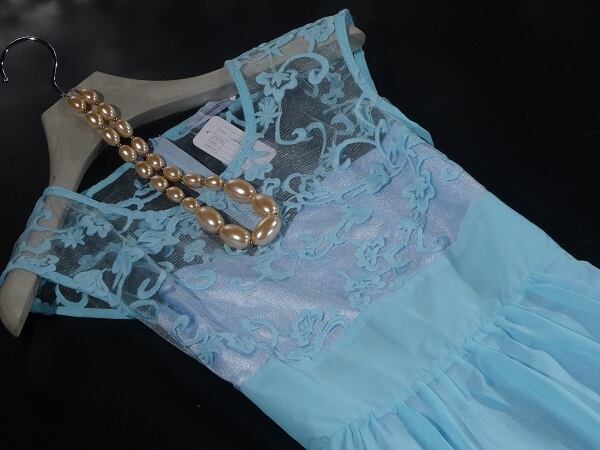 綺麗な水色のドレス。背中はウエストまでレース仕様。胸元のレースがデコルテラインを程よくセクシーに見せてくれています。パーティ、イベント、結婚式の二次会、コンサートなど幅広いシーンで活躍してくれる一着です。胸カップ仕様。背中ファスナー。裏地あり。