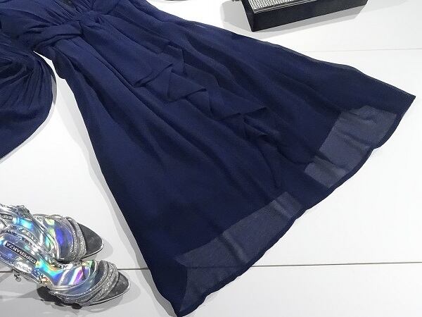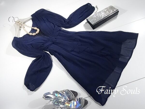 シフォン素材で袖は大人気のグラデ-ションプリ-ツになっていてウエストリボンは調整可。胸元のレ-スがとても上品でスカ-ト部分は沢山のタックが入りふんわり柔らか、お呼ばれドレスにピッタリです。背中ファスナー。裏地付。