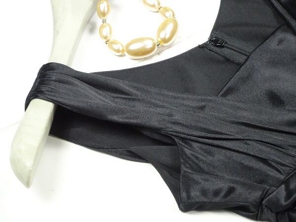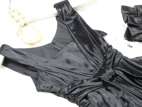 綺麗な光沢素材のパ-ティ-ドレスです。生地を沢山使いドレ-プがとても綺麗です。肌触りが良く結婚式やパ-ティ-にいかがでしょうか。背中ファスナ-あり。裏地有り。