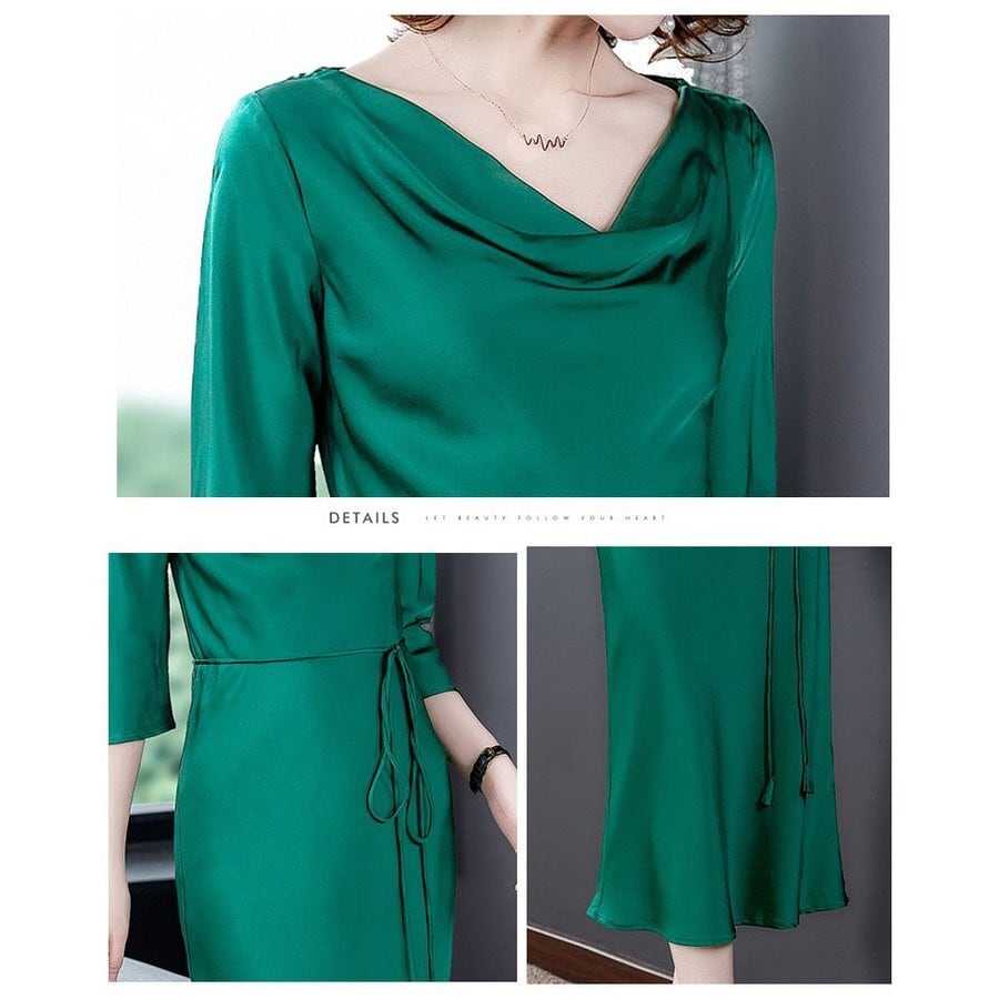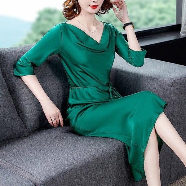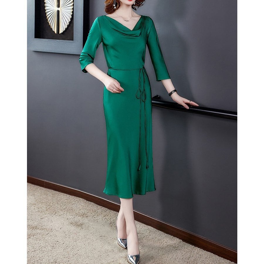 つるつるサテン紐ベルト付ワンピ-スです。胸元ドレ-プのシンプルデザインで、裏地はついておらずとても軽く着こなしやすいです。同布の紐ベルトをきゅっと結んでアクセントに。セクシーかつ高級感あふれる一着です。裏地なし。背中ファスナ-なし(かぶるタイプ)。同布紐ベルト付き。