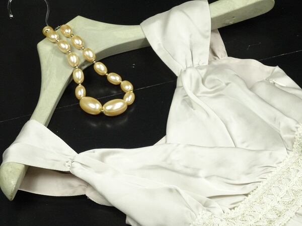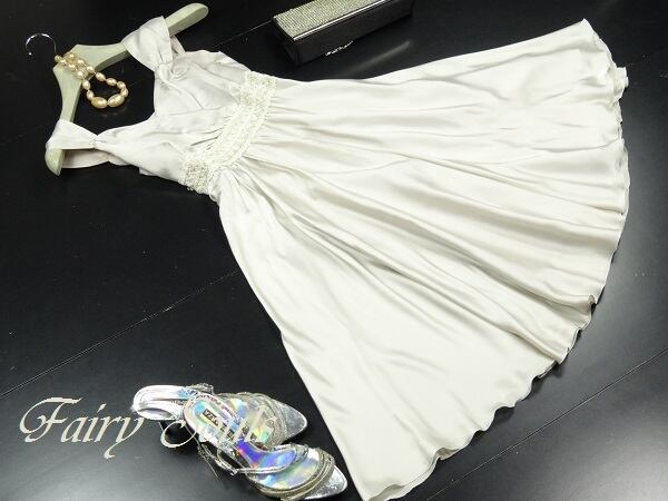 シルバ-の光沢素材のノースリ-ブワンピ-スです。ウエストの刺繍がとても豪華で素敵です。左サイドファスナ-有。裏地あり。