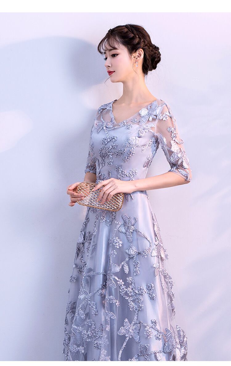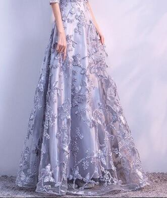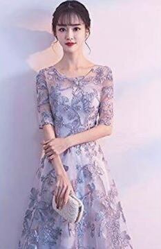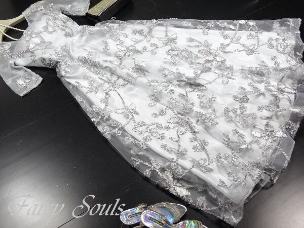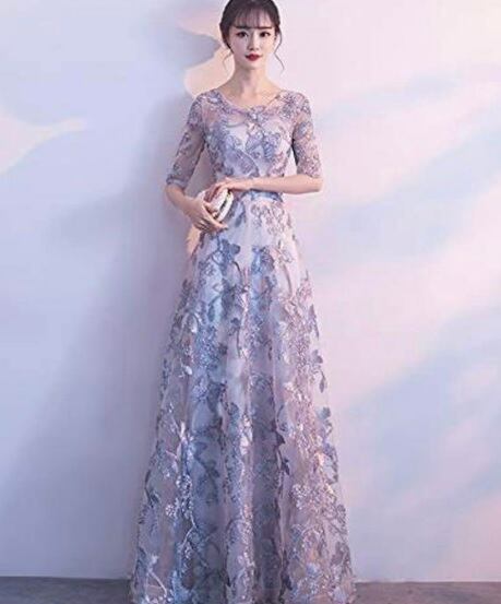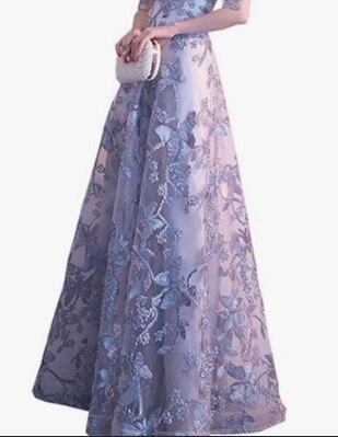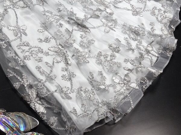 立体刺繍レースパーティ-ロングドレスです。デコルテの透け感がとても美しく大人の女性を醸し出してくれるエレガントなロングドレスです。全体に銀糸の刺繍が施されデザイン性のあるスタイルがとても魅力的な一着です。サテン地にチュ-ルが重ねられ全体的に優しい感じに仕上げられています。背中ファスナ-有。胸パット付き。裏地なし。