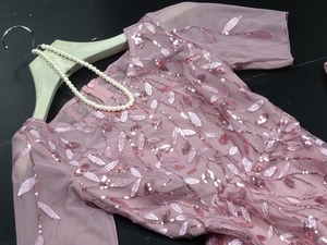 チュールとスパンコール刺繍のマーメイドドレス。渋みのあるスモーキーピンクのチュール地に同色のスパンコールと光沢のある糸でふんだんに刺繍をほどこした豪華なデザイン。くびれたウエストと太ももあたりから裾にかけて広がるデザインががセクシーさを醸し出しています。パーティやライブ、イベントなど華やかなシーンに。デザイン上伸縮性はそれほどなく体のラインにフィットしたシルエットです。背中ファスナー有。裏地なし(ジャージ素材の下地にチュールをかぶせています)。