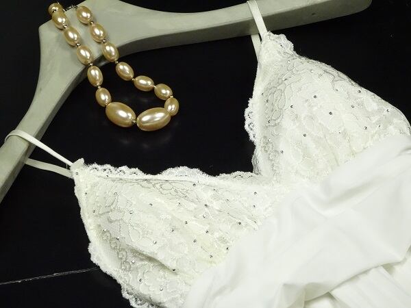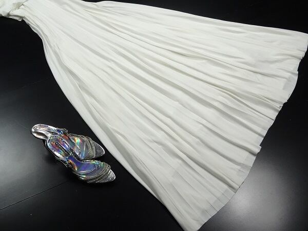 清楚で綺麗なお姫様気分の白いロングドレスです。スカ-トの切替はハイウエストで綺麗なプリ-ツになっています。ストレッチ効いてます。肩紐調整可。裏地あり。