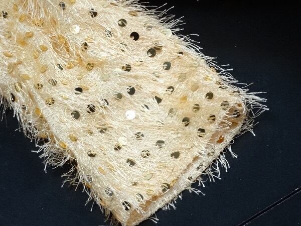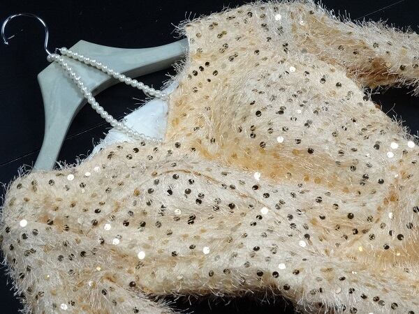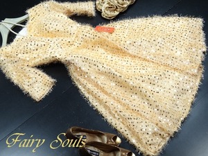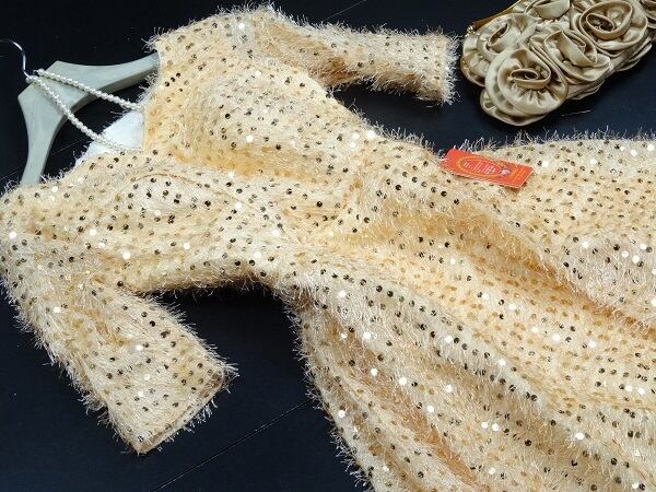 フリンジとスパンコール飾りのミディアムドレスです。かわいいゴールドオレンジの生地に、同色のフリンジと金のスパンコールを全身にあしらった華やかでキュートなデザイン。胸パッドもついているのでしっかりとしており、パーティやイベント、結婚式など、様々なシーンで活躍。気品のある印象を与えてくれる一枚です。背中ファスナ-有。胸パット付。裏地有。
