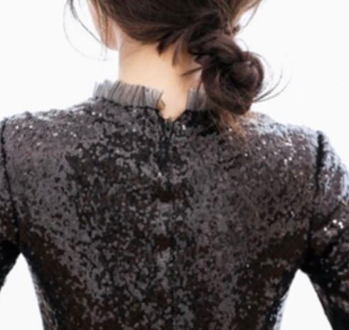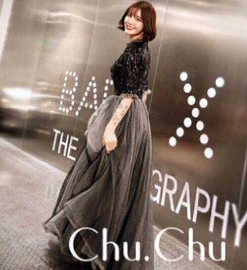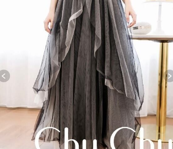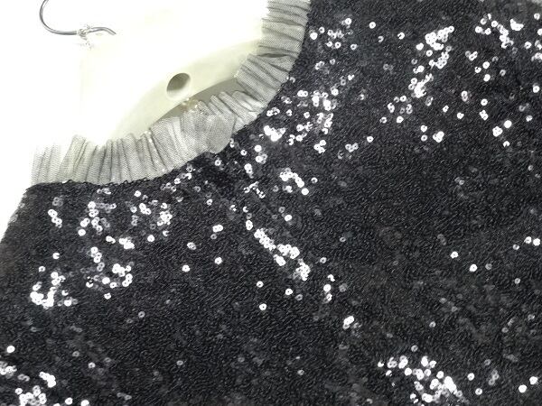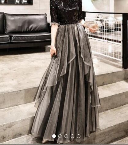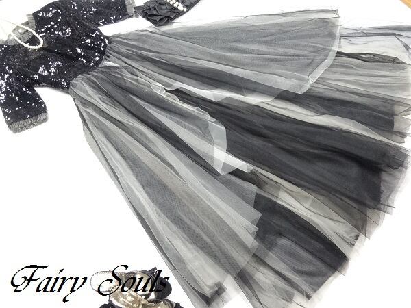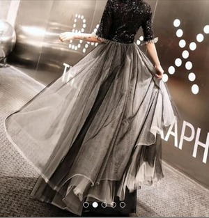 スパンコ-ルとチュールのロングドレス。トップス部分は黒地に黒の小さなスパンコ-ルを全体にあしらい華やかな仕様に。スカ-ト部分は黒とグレーと白のチュールを3枚重ね、ボリューム感のあるゴージャスな印象のデザインになっています。パーティやイベント、結婚式など、様々なシーンで、気品のある印象を与えてくれる一枚です。裏地なし。背中ファスナ-有。胸パッド付。