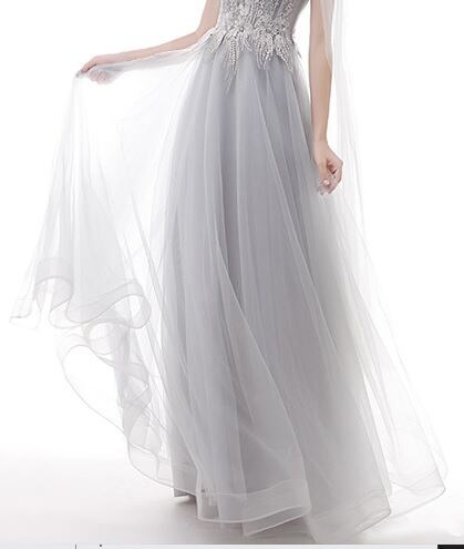 銀糸刺繍とチュールのロングドレス。グレーのサテン地にチュールを重ね全体的にフェミニンでエレガントな雰囲気に。上半身はチュールに銀糸刺繍とビジューをあしらい、肩からチュールをふんわりとかけ、腕をカバーしています。下半身はチュールをたっぷりと使用しゴージャスでな印象に。パーティやイベント、結婚式など、様々なシーンで、気品のある印象を与えてくれる一枚です。裏地なし(チュールとサテンの2枚重ね)。背中編み紐掛け。腰下からファスナ-有。胸パット付。