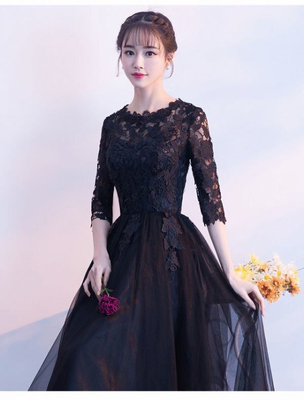チュールとレースのシックなドレス。黒のサテン地の上にチュールをかぶせ、上半身と袖はレース仕様になっています。シックで品があり華やかな、コンサート、ライブ、結婚式の二次会、パーティにとどんなシーンにも活躍してくれる一着です。裏地あり。背中ファスナ-有。胸パット付き。ウエストはゴム仕様ではないため伸縮性はありません。