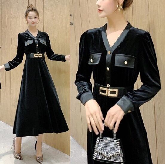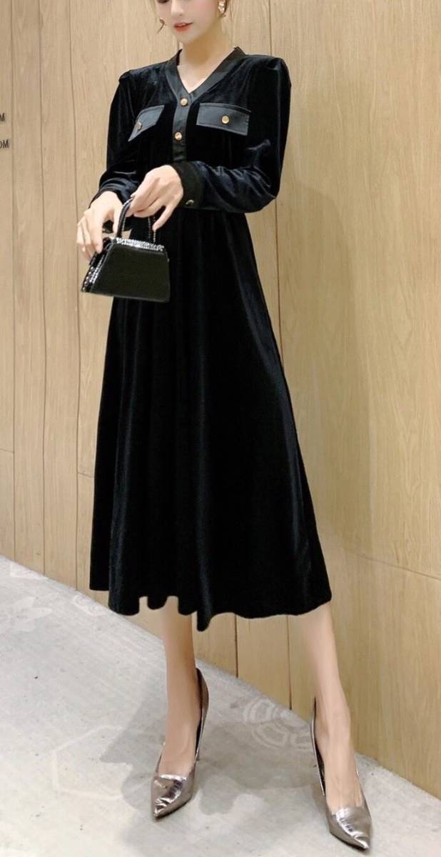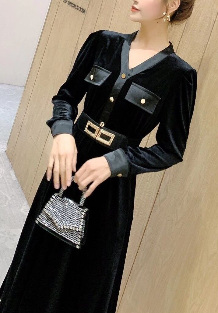 ベルベットロング丈のワンピ-ス。艶のある黒のベルベットが気品に満ちたとてもエレガントで上品なひとクラス上をいくデザイン。黒地に金色のボタンを配し、襟元、胸元、袖先には黒のサテンでアクセントに。フォーマルなシーンに上品な印象を与えてくれる一着です。裏地なし。背中ファスナ-有。ベルト付き。