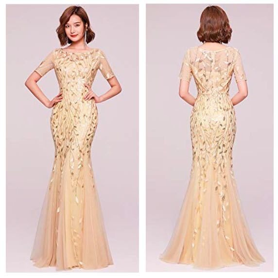 マーメイドパーティ-ロングドレスです。全体にビジュ-が施されゴ-ルドの光沢が高級感を醸しだしてくれてます。とてもエレガントです。着心地もフィット感があり抜群です。パーティやライブ、イベント、結婚式など、どんなシーンでも活躍してくれる一着です。裏地有。背中ファスナー有。