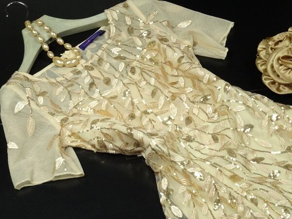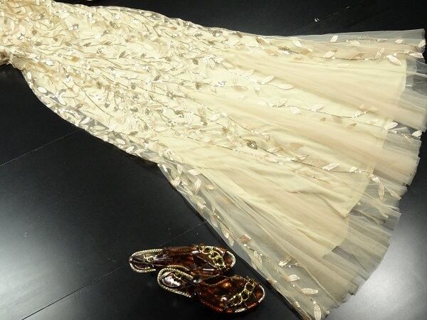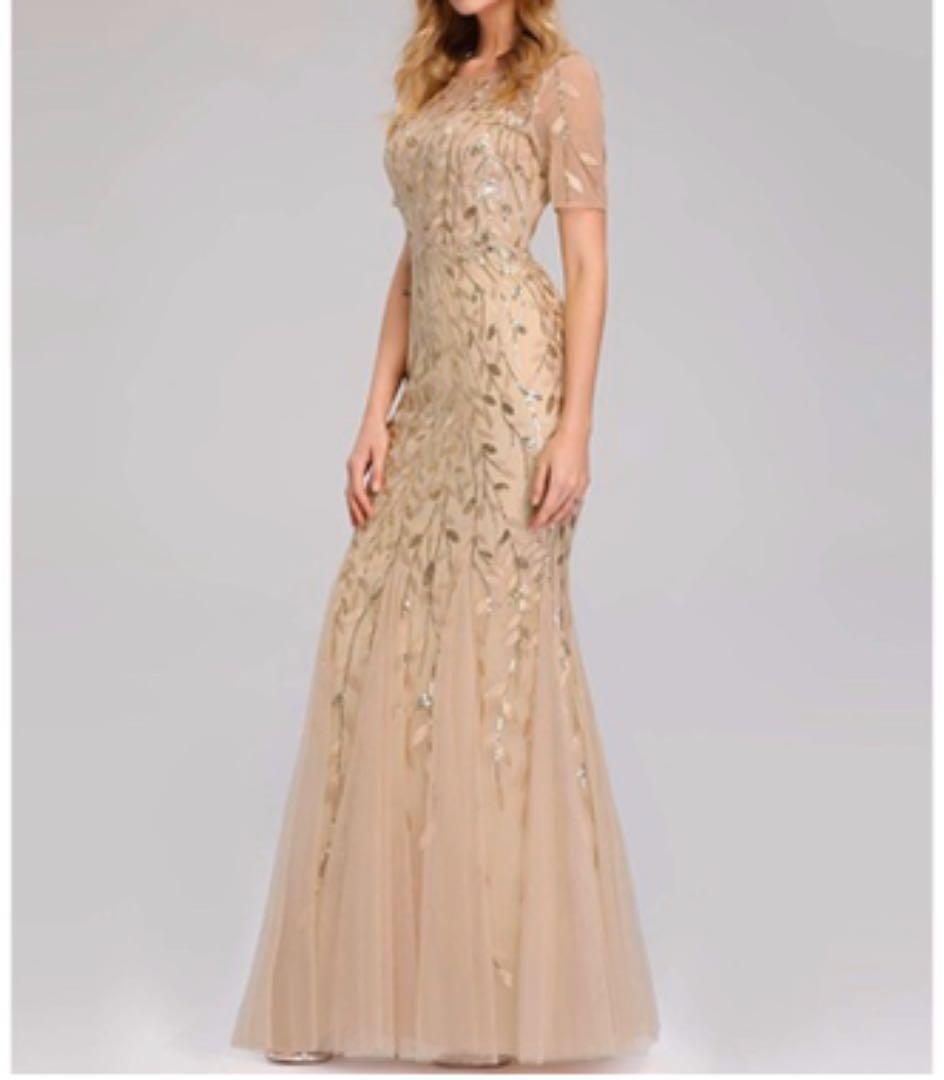 マーメイドパーティ-ロングドレスです。全体にビジュ-が施されゴ-ルドの光沢が高級感を醸しだしてくれてます。とてもエレガントです。着心地もフィット感があり抜群です。パーティやライブ、イベント、結婚式など、どんなシーンでも活躍してくれる一着です。裏地有。背中ファスナー有。