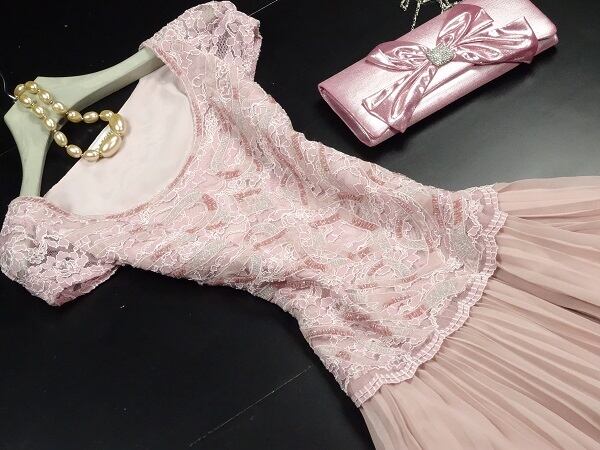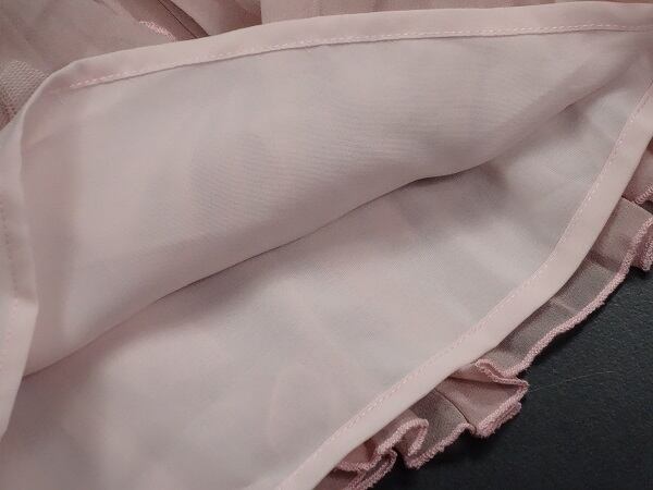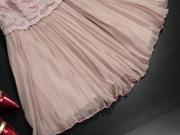 ピンクの鮮やかなシフォンスカ-トが涼しげです。今年大人気の花柄刺繍とプリ-ツの組み合わせが可愛いです。結婚式やパ-ティ-にもお薦めの商品です。裏地付。