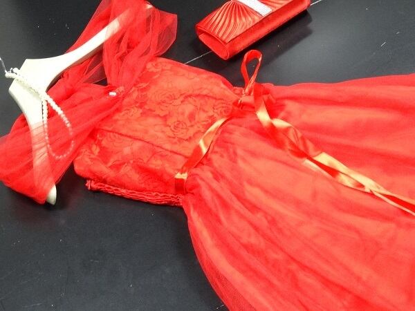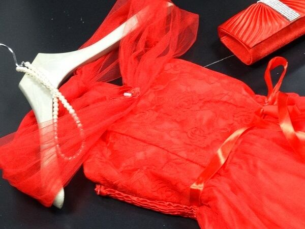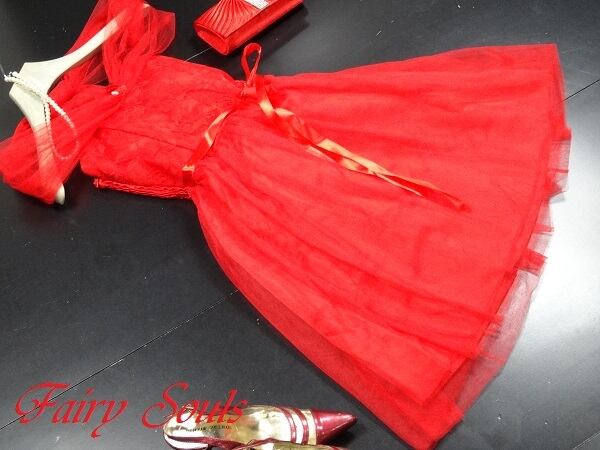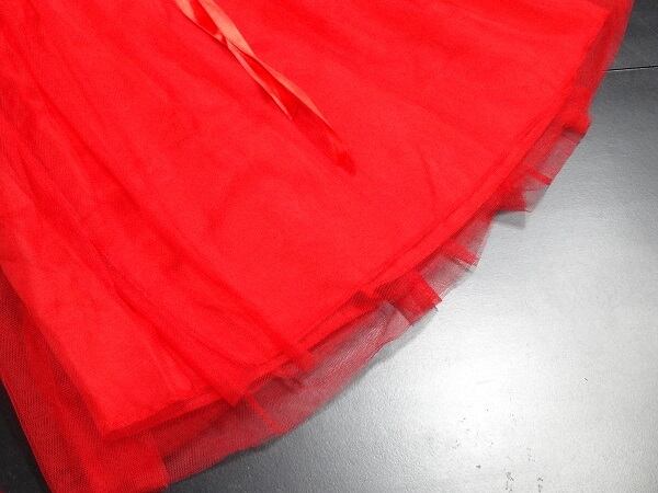 鮮やか赤の総チュ-ルミニドレス。鮮やかな赤のサテン地の上にチュールレースを重ねた華やかな一着。ベアタイプに胸元から長く伸びたチュールを肩から背中部分に回して、背中でリボン結びをし、一見オフショルダーに見えるデザインがおしゃれ。パーティやライブ、イベント、結婚式など、どんなシーンでも活躍してくれる一着です。裏地なし。右脇ファスナー有。胸パット付き。
