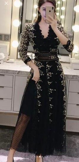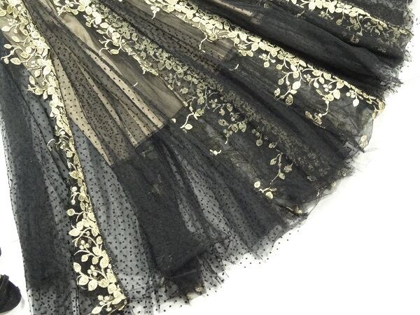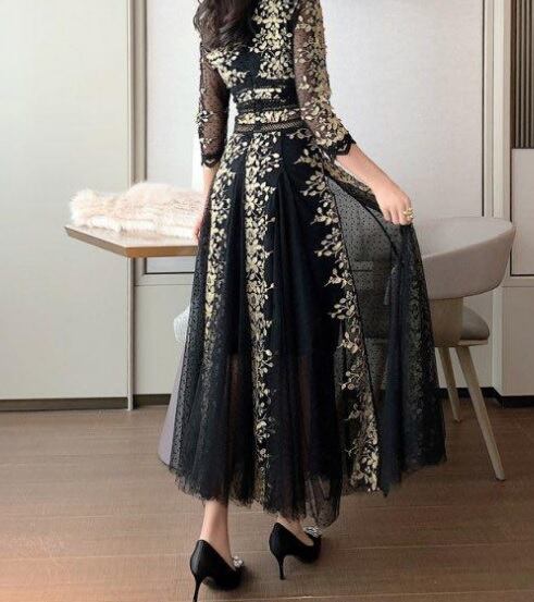 総チュール金糸刺繍のワンピース。縦に流れるように刺繍された金糸が黒のネットチュールに映えて、エレガントで上品な印象に仕上がっています。胸元はV字にカットされた縁をレースで飾り、ウエスト部分は横にレースと刺繍をあしらいアクセントに。膝から下の足元もほんのり肌の透け感が美しいデザインになっています。ちょっとおしゃれな普段着としても、またフォーマルなシーンにも活躍してくれる、大人の女性を醸し出してくれる一着です。裏地有。背中ファスナ-付。