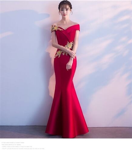 豪華な立体刺繍のマーメイドロングドレスです。鮮やかなしっかりとした赤の生地に、胸元とウエストに豪華なゴールドの立体刺繍をほどこした美しい一着。オフショルダーのデザインが女性らしさを引き出してくれています。パーティやライブ、イベント、結婚式など、どんなシーンでも活躍してくれる一着です。伸縮性はありません。背中ファスナー有。裏地なし。