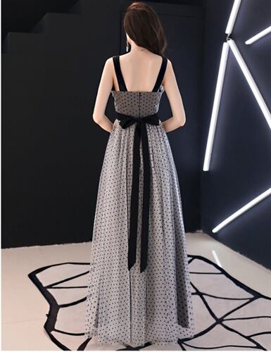 水玉チュールのパ-ティ-ドレス。黒の下地の上に、黒の水玉を全体にあしらった白のチュールを重ねています。前でクロスさせた黒のウエストベルトは、背中側でリボン結びになっています。肩は、前側は白に黒の水玉のチュールですが、肩の上部でウエストベルトと同じ伸縮性のある黒のジャージ素材に切り替わっています。後ろ側は背中中央位まで開いており、前と後ろで雰囲気の変わるユニークで美しいデザインになっています。チュールをたっぷりと使用し豪華な雰囲気の、パーティやイベント、結婚式など、様々なシーンで、気品のある印象を与えてくれる一枚です。裏地なし。背中ファスナ-有。
