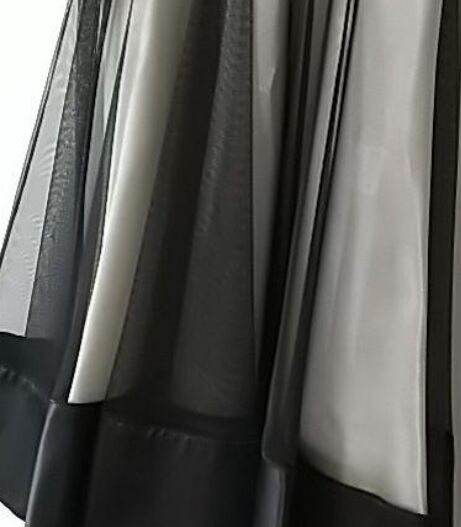 パーティーキャミドレスです。光沢のあるシャンパンゴールドのサテン地に、上は黒のサテン地を切り返しで合わせ、スカート部分は黒のチュールを重ねています。胸元と脇の部分にドレープを入れて着やすさも実現。品のあるキュートな一着です。裏地あり。右脇ファスナ-付き。ストラップは調整可能。