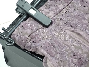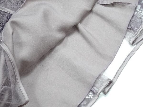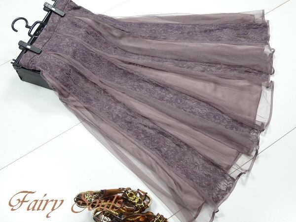 レースとチュ-ルのマキシ丈フレア-スカ-ト。落ち着いたスモーキーパープルのサテン地の上に、同色のレースを施したチュール地をふんだんに使用したボリューム感のあるエレガントなデザイン。歩くと裾の揺れ感が素敵です。ウエストはゴム仕様ではないのでそれほど伸縮性はありません。裏地有。ファスナ-後ろ。