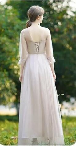 チュール袖フリルのパ-ティ-ロングドレスです。ピンクのサテン地の上に同色のチュールを重ねて豪華な雰囲気に。トップス部分は立体刺繍が施されたチュ-ルが重ねられ華やかに。袖は七分袖、袖先をゴムできゅっと絞り、肩先からのふくらみがとってもキュート。たっぷりとチュールを使用した広がるデザインで動きやすくなっています。パーティやイベント、結婚式など、様々なシーンで、気品のある印象を与えてくれる一枚です。裏地有。背中網掛け。腰下ファスナ-有。胸パット付き。