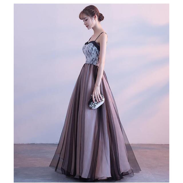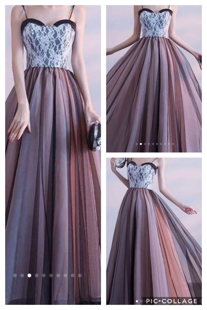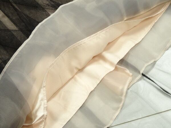 チュールのロングパーティードレス。落ち着いたゴールドベージュのサテン地の上に黒のチュールを2重に重ねた豪華なデザイン。胸元は白のチュールに刺繍を配し、スカ-ト部分はサテン地に黒のチュ-ルをたっぷりと重ね、エレガントでありゴージャスな印象に。パーティやイベント、結婚式など、様々なシーンで、気品のある印象を与えてくれる一枚です。裏地有。背中ファスナー有。胸パット付き。