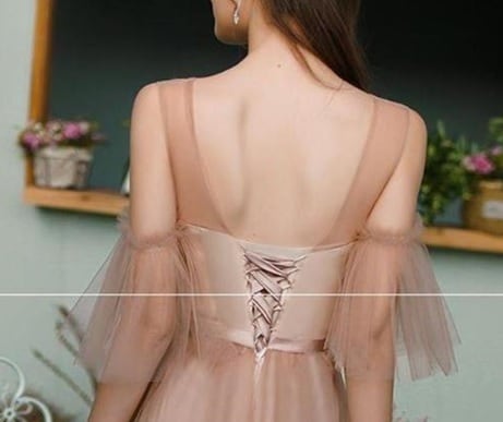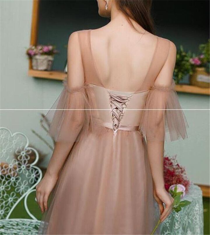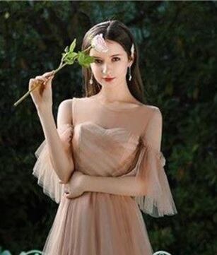 チュールロング丈パ-ティ-ドレスです。ゴールドブラウンのサテン地に同色のチュールをかぶせたエレガントなデザイン。袖は肩をみせて二の腕からフリル仕様になっています。デコルテラインはチュールのみでほんのり透け感が大人の魅力をアップ。パーティやイベント、結婚式など、様々なシーンで、気品のある印象を与えてくれる一枚です。背中結び紐有り。背中腰から下ファスナ-有。胸パット付。透明な肩紐付き。裏地有。