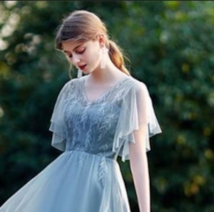 チュール袖フリルのパ-ティ-ロングドレスです。ダークブル-のサテン地の上に同色のチュールを重ねて豪華な雰囲気に。トップス部分は立体刺繍が施されたチュ-ルが重ねられ華やかに。袖は肩からたっぷりとチュールを使用した広がるデザインで動きやすくなっています。パーティやイベント、結婚式など、様々なシーンで、気品のある印象を与えてくれる一枚です。裏地有。背中網掛け。腰下ファスナ-有。胸パット付き。(ロングの方です。)