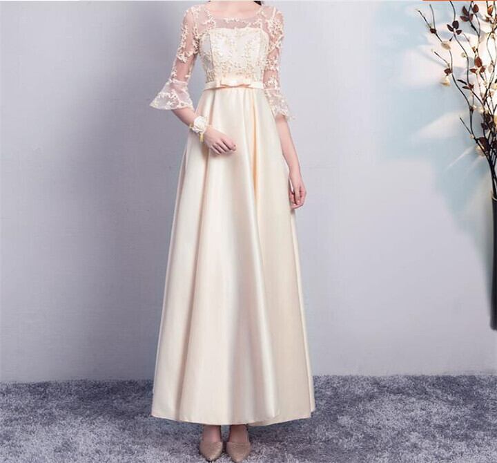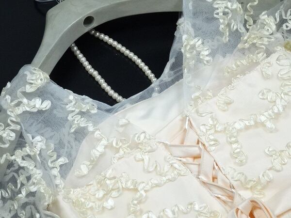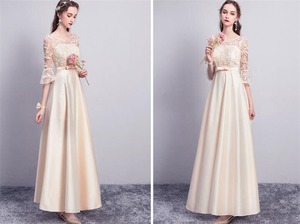 サテンとチュールのパーティーロングドレス。シャンパンゴールドのサテン地に上半身はリボン刺繍を施した同色のチュールを重ねています。胸元と袖はチュールのみで透け感が美しく、エレガントで上品な雰囲気になっています。背中はウエストまで編み紐掛けなので、バストサイズにゆとりをもって着用いただけます。パーティやイベント、結婚式など、様々なシーンで、気品のある印象を与えてくれる一枚です。裏地有。背中編み紐掛け。腰下ファスナ-有。胸パッド付。袖につける小さなコサージュ付きです。