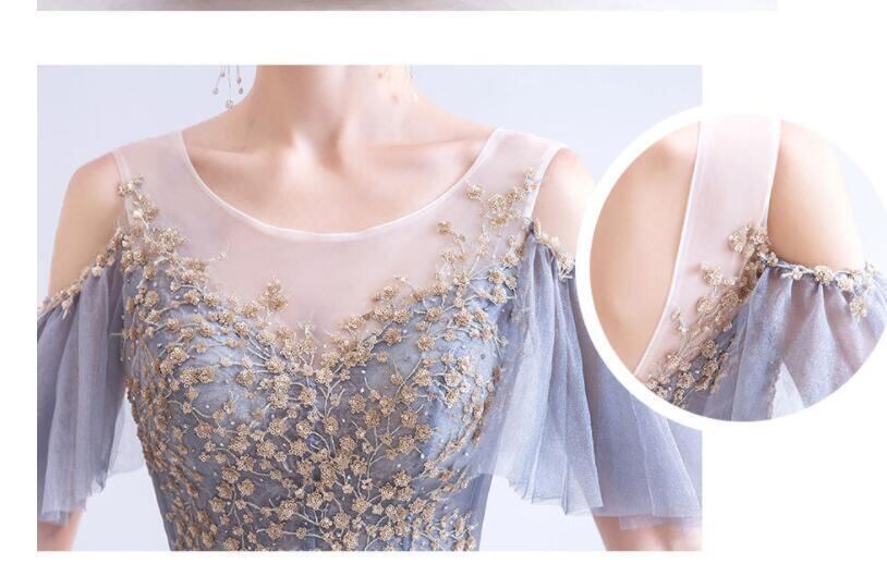 金糸刺繍とチュールのロングドレスです。ゴールドのサテン地にチュールを重ね全体的にフェミニンでエレガントな雰囲気に。上半身はチュールに金糸刺繍とビジューをあしらい、肩からチュールをふんわりとかけ、腕をカバーしています。下半身はチュールをたっぷりと使用しゴージャスでな印象に。パーティやイベント、結婚式など、様々なシーンで、気品のある印象を与えてくれる一枚です。裏地なし(チュールとサテンの2枚重ね)。背中編み紐掛け。ファスナ-なし。胸パット付。
