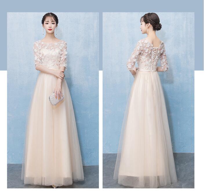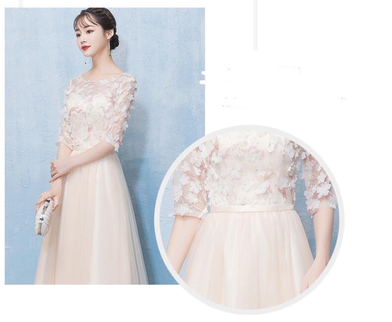 サテンとチュールのパーティーロングドレス。クリームカラーののサテン地に、上半身は小さな可愛い花のモチーフいっぱいにあしらった同色のチュールを重ねています。胸元と袖はチュールのみで透け感が美しく、エレガントで上品な雰囲気になっています。背中はウエストまで編み紐掛けなので、バストサイズにゆとりをもって着用いただけます。パーティやイベント、結婚式など、様々なシーンで、気品のある印象を与えてくれる一枚です。裏地有。背中編み紐掛け。腰下ファスナ-有。胸パッド付。
