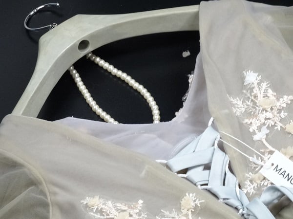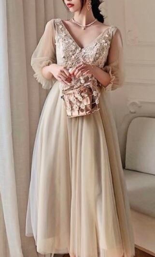 トップス部分花柄刺繍チュールパ-ティ-ミディアムドレス。落ち着いた伸縮性のあるカーキー色の裏地の上に、少しスモーキーな白のネットチュールを3重にかぶせています。トップスにはシャンパンゴールドの刺繍が施されたレースが重ねられとても豪華な雰囲気に。袖はチュールを袖先できゅっと絞りふんわりとしたラインに仕上げています。背中は編紐掛けになっていてバストサイズにゆとりをもって着用いただけます。