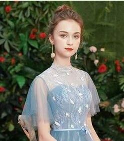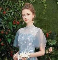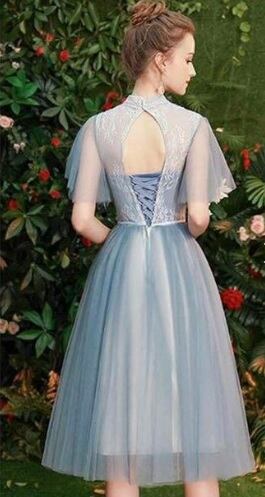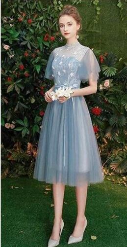 チュールミディアム丈ドレスです。白色のサテン地に水色のチュールをかぶせたエレガントなデザイン。袖は肩をみせて二の腕からフリル仕様になっています。デコルテラインはチュールのみでほんのり透け感が大人の魅力をアップ。背中は網掛け・腰下ファスナ-で結び具合によりバストサイズが2~3cm大・小出来ます。パーティやイベント、結婚式など、様々なシーンで、気品のある印象を与えてくれる一枚です。背中網掛け。腰から下ファスナ-有。胸パット付。裏地有。