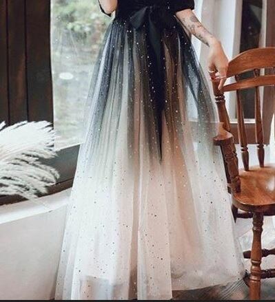 星柄チュールのパ-ティ-ドレスです。ウエストから裾にかけてのスカート部分には小さな星や丸形のスパンコールがあしらわれたチュ-ルを白のサテン地の上に重ねた、黒から白へグラデーションが美しい豪華な印象に仕上げられています。パーティやイベント、結婚式など、様々なシーンで、気品のある印象を与えてくれる一枚です。裏地なし。背中ファスナ-有。胸パット付。同布ベルト付き。
