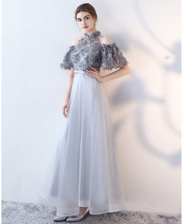 モチーフチュールのパーティーロングドレス。落ち着いたグレーのチュール地をたっぷり使用し、上半身にはチュール地にたくさんの同色の花のモチーフと艶のある糸で刺繍をあしらっています。襟はベルトカラータイプ。左右は袖との間異がオープンになっており、首から肩のラインを美しく見せています。袖もふっくらしたチュールにモチーフを飾り豪華な印象に。ウエストにはサテンの細いリボンベルトをあしらい、すそにかけてチュールがボリューム感をだし、豪華な印象に仕上げています。結婚式、パーティ、イベントなど華やかなシーンにぴったりの一着です。着脱は背中ファスナ-。裏地あり。胸パット付き。