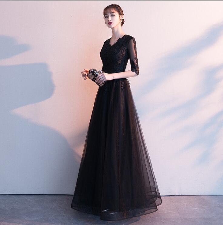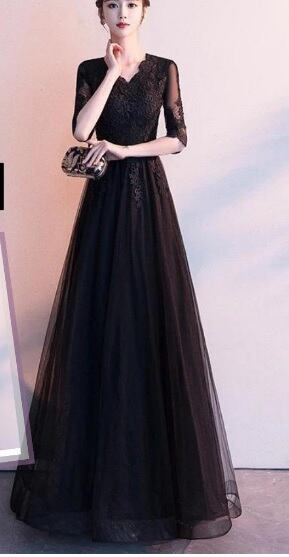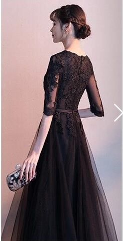 立体刺繍ロングチュ-ルパ-ティ-ドレス。シックな黒のサテン地の上に、同色の立体刺繍をほどこしたチュ-ルが重ねられた豪華でフェミニンなデザイン。V字の胸元が大人の雰囲気を醸し出し、シックで上品な女性を表現。パーティやイベント、コンサート、結婚式にと、さまざまシーンで活躍してくれる美しい一着です。背中ファスナー有。胸パット付。