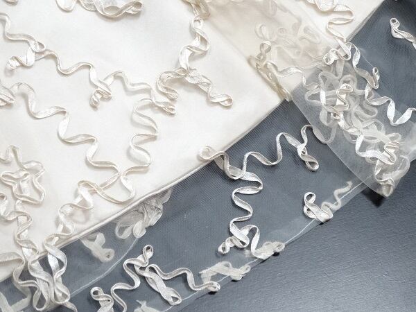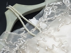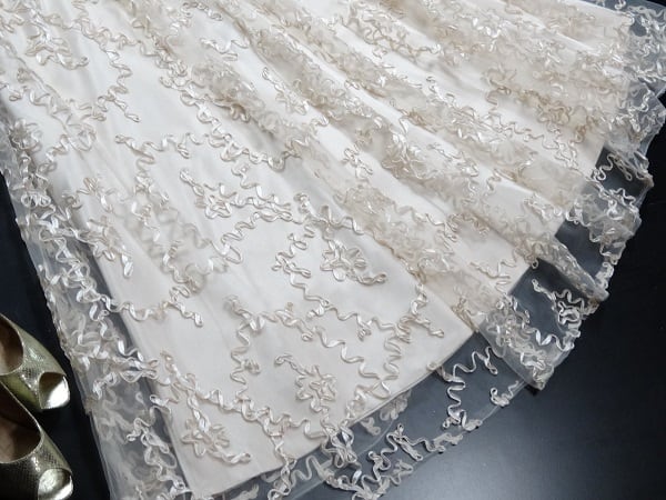 リボン刺繍のパーティ-ロングドレス。袖やデコルテの透け感がとても美しく大人の女性を醸し出してくれるエレガントなデザイン。全体にゴールドベージュの立体刺繍が施されデザイン性のあるスタイルがとても魅力的な一着です。モデル着用の色はピンクぽいですが、実際は平置き画像が実物画像になります。全体的に優しい感じに仕上げられています。背中ファスナ-有。胸パット付き。