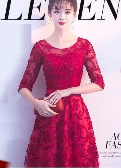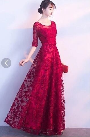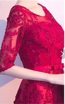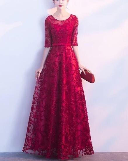 リボン刺繍のパーティ-ロングドレス。袖やデコルテの透け感がとても美しく大人の女性を醸し出してくれるエレガントなデザイン。全体にワインレッドの立体刺繍が施されデザイン性のあるスタイルがとても魅力的な一着です。全体的に優しい感じに仕上げられています。背中ファスナ-有。胸パット付き。