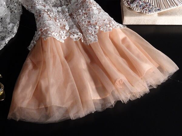 白の花柄レースとピンクのたっぷりシフォんが美しいワンピース。前身頃には、襟元からウエストまで金色のリボンがアクセが付いた白のリボンがあしらわれています。袖の透け感のあるレースが魅力的。結婚式の二次会、パーティなど様々なシーンで活躍してくれる一着です。背中ファスナー。裏地あり。