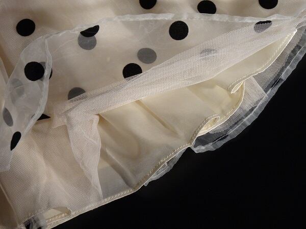 ドット柄ミニワンピドレスです。スカートはレースが重ねられとても女性らしい一着です。着心地の良い、上品な印象の一着です。ファスナーあり。裏地付。